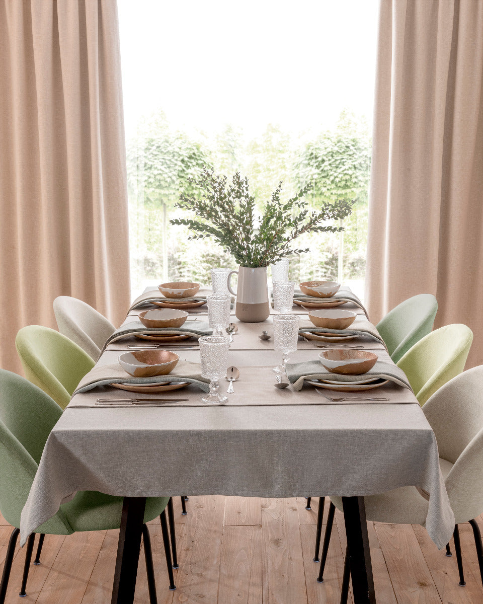 Hard wearing linen look fabric suitable for curtains and upholstery. Free samples available.