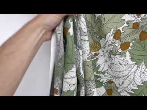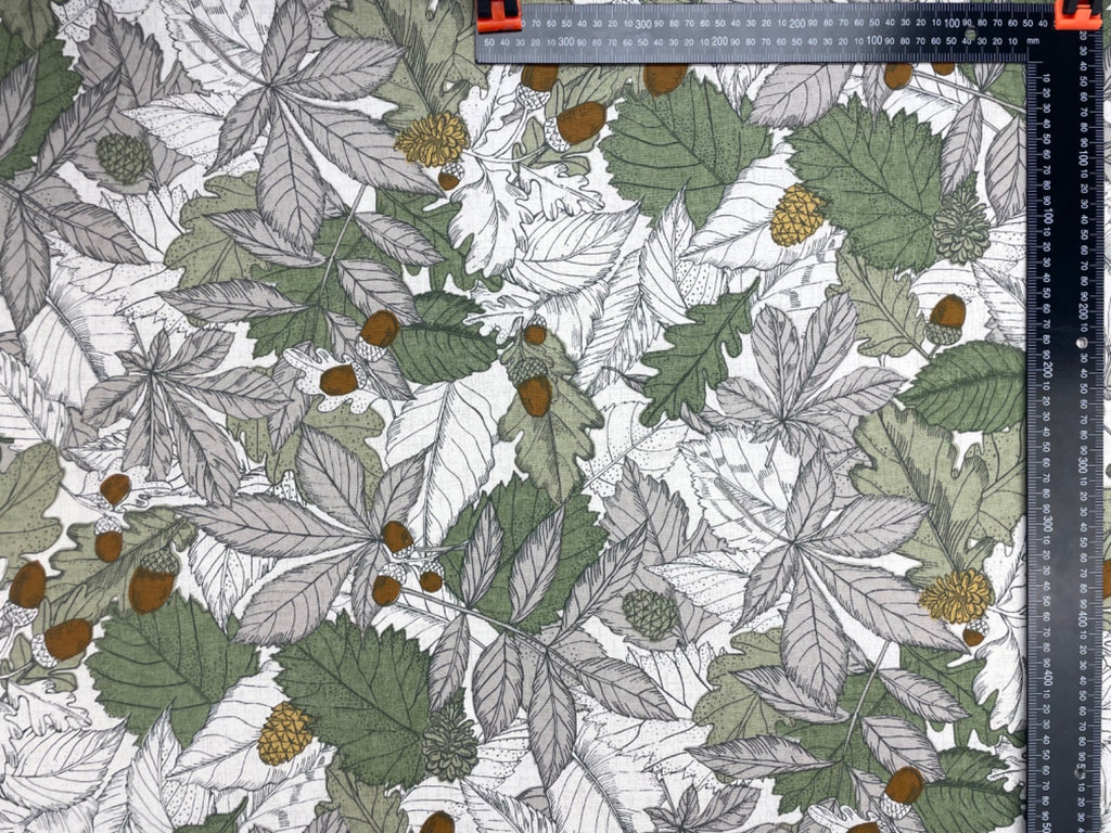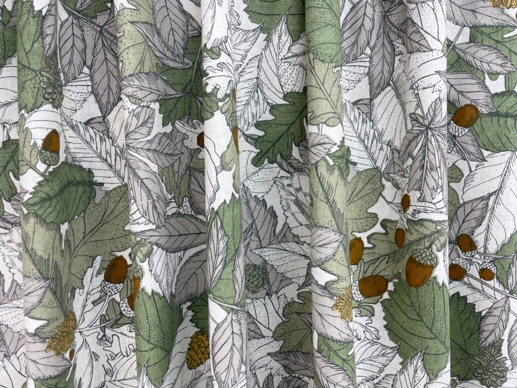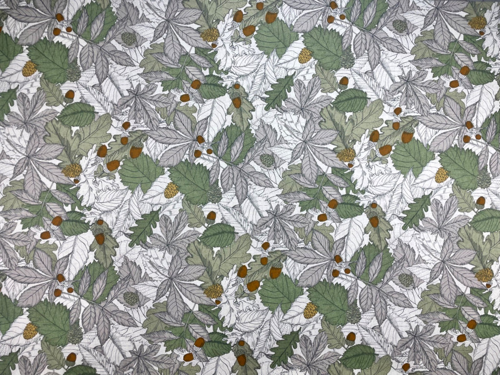 Like the forest floor in autumn, oak, chestnut, maple and sycamore leaves layer across Mercia's midscale print, which is hand drawn with pen and ink. Contrasting pinecones add a pop of highlight colour to the design and a linen look texture runs throughout.