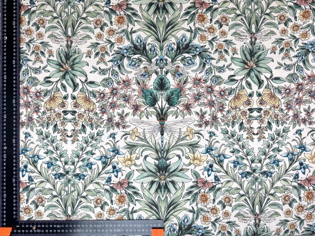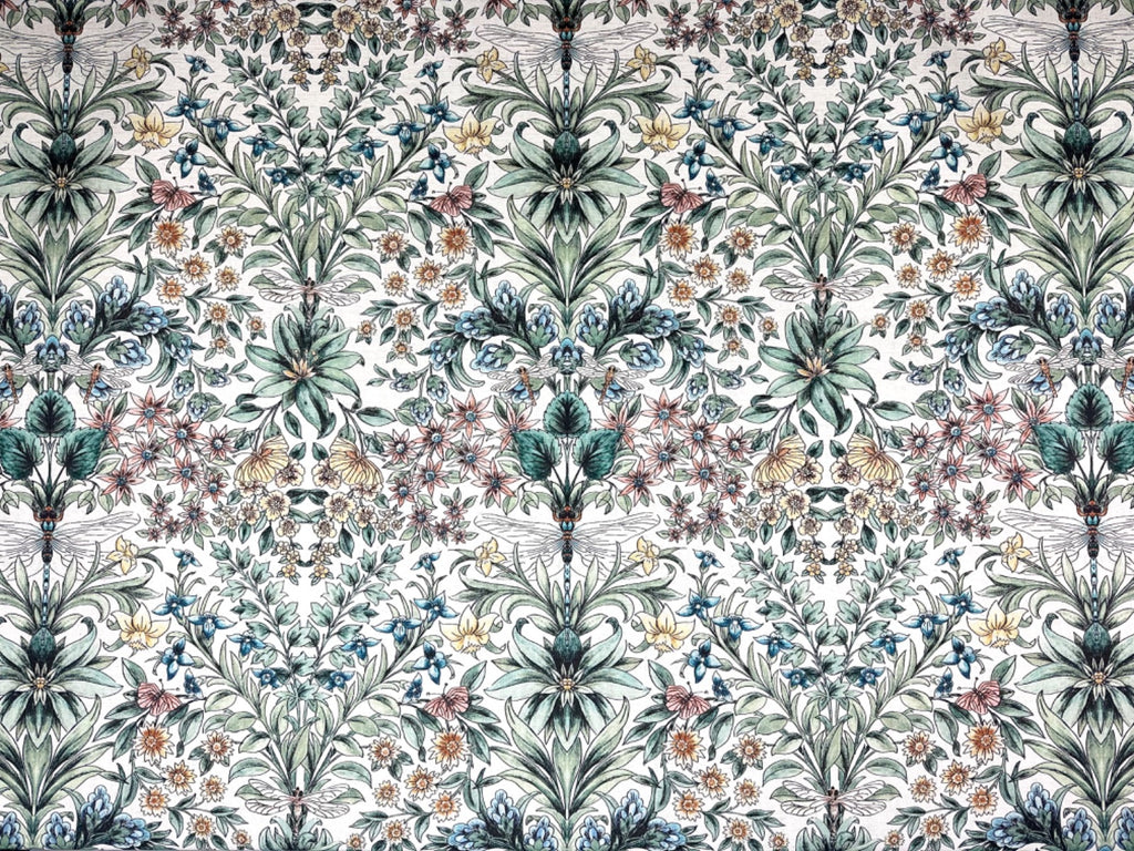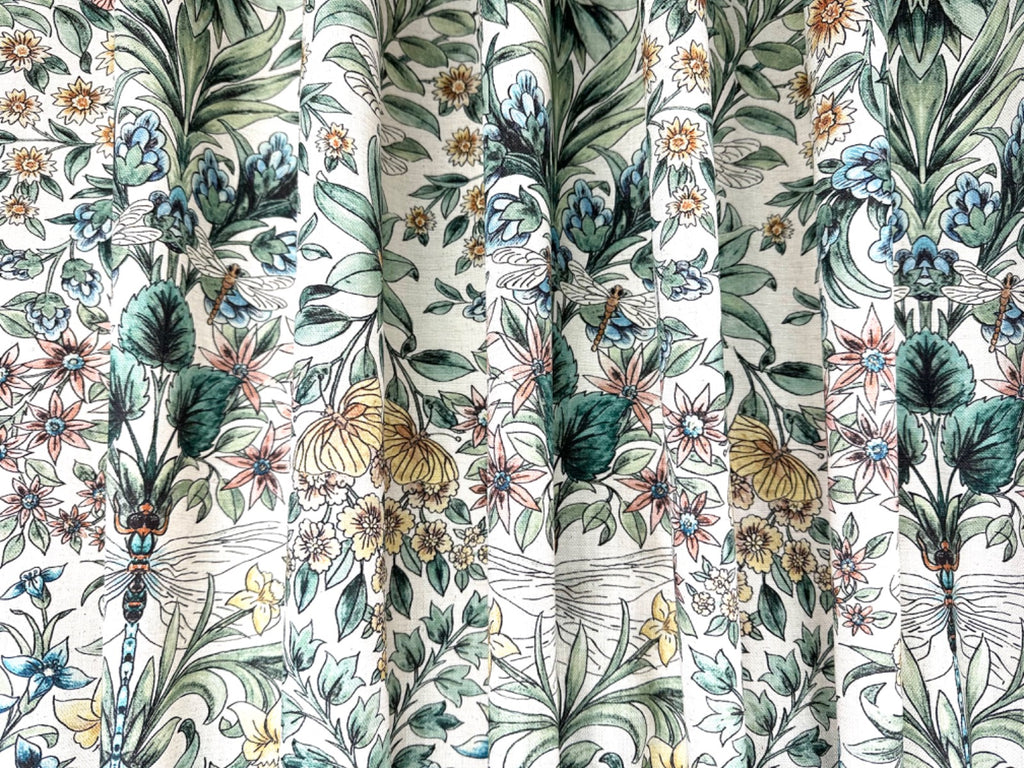 Mirabell is a feature print design in this collection, a bold kaleidoscope of nature's most visually engaging patterns. Dragonflies meet luscious flora for a botanical feel. The rustic base cloth of light linen adds to the Arts and Crafts feel, aptly named after the garden of the famous grand palace in Saltzburg.