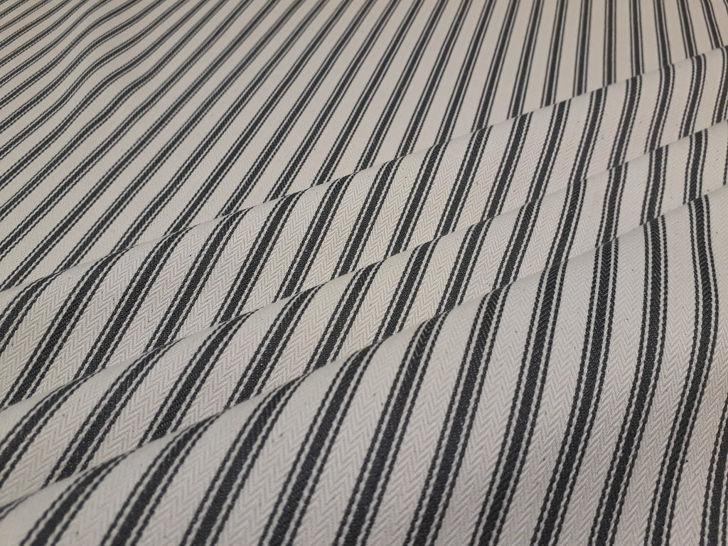 100% Cotton ticking woven stripe curtain, soft furnishing and light domestic upholstery fabric. Free samples available.