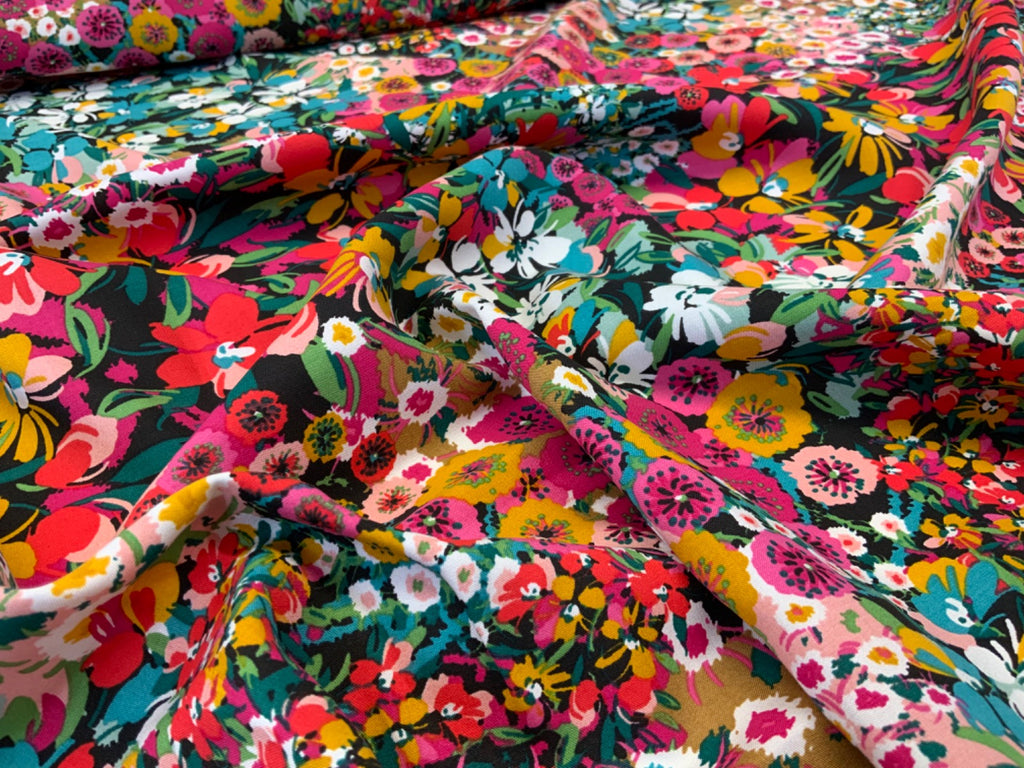 This lovely printed100% viscose meets the Okeo-Tex standard 100. Its composition gives its a light, soft and floaty feel but for a viscose this fabric isn't overly fluid, its finish is quite similar to a cotton lawn which will make it easy to sew and beautiful to wear.