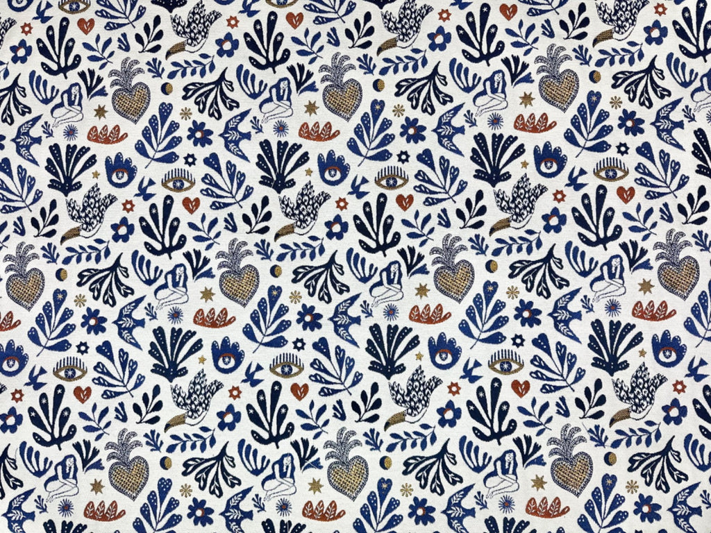 This Matisse inspired tapestry fabric is a perfect weight for interior projects such as curtains, soft furnishings and light upholstery. It has metallic gold yarn woven throughout its design to emphasise the yellow patterns within the fabric. These woven designs are also popular for some fashion projects such as bags and jackets.