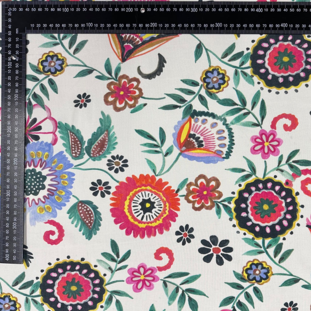 Crafted from high-quality viscose, this fabric offers a smooth, breathable feel and a beautiful fluid drape, making it ideal for dresses, skirts, blouses, and floaty tops. The bold multi-coloured print inspired by Indian textiles creates a stunning, statement look.