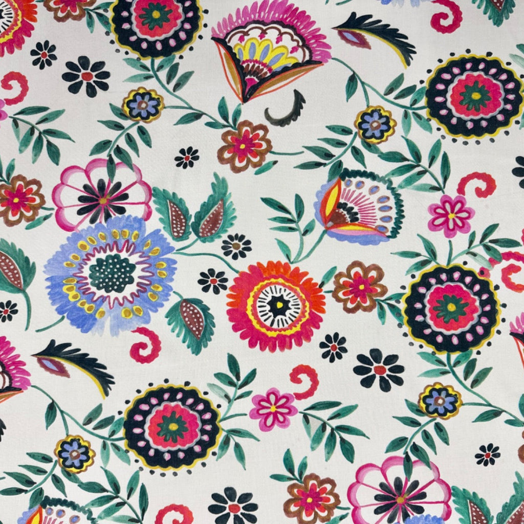 Add some colour and fun to your wardrobe with our H366 Folklore Viscose Multi. This lightweight, soft-drape fabric features a vibrant floral design that’s perfect for creating standout garments with a bohemian flair.