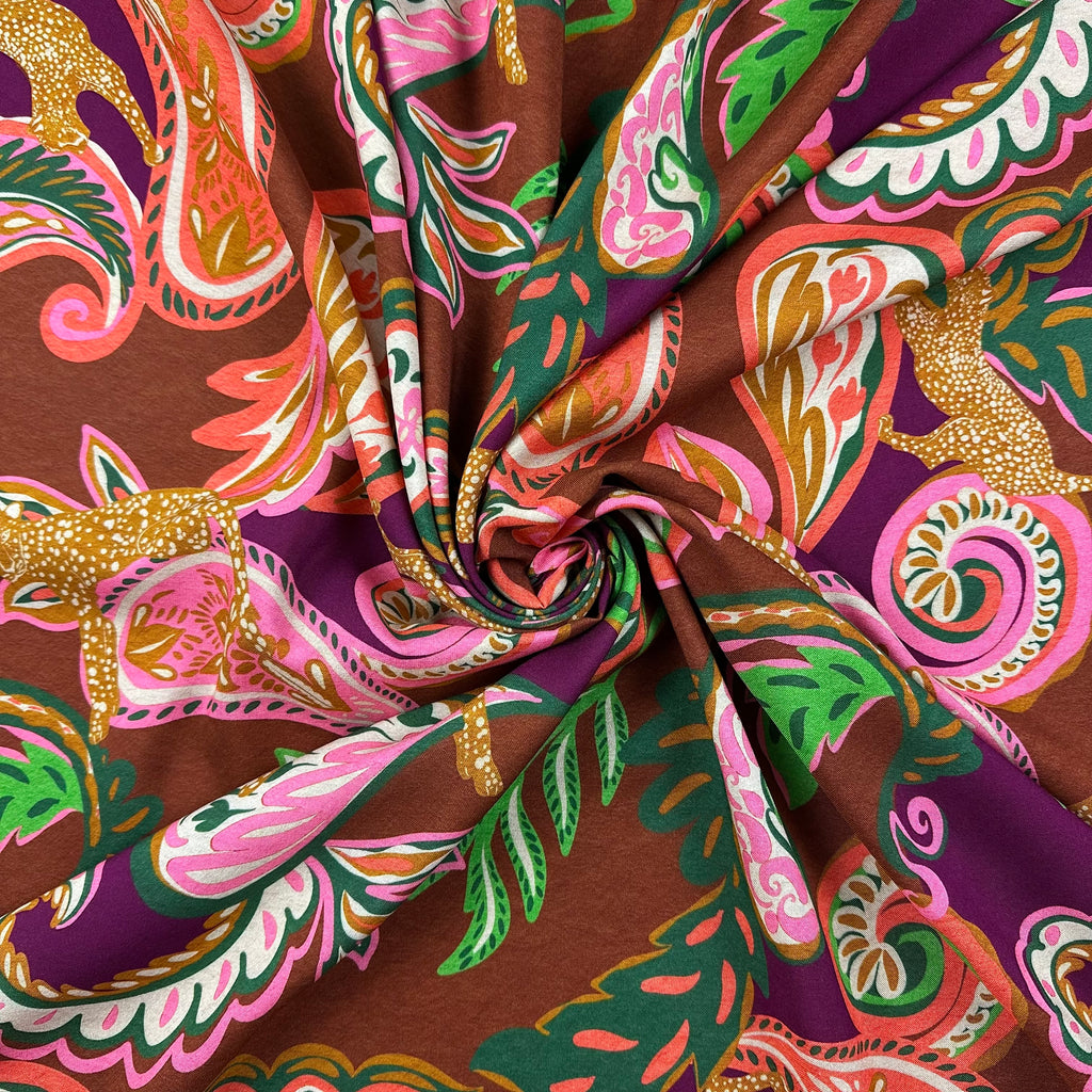 Add some colour and fun to your wardrobe with our Savanna Multi Viscose. This lightweight, soft-drape fabric features a vibrant paisley design with lounging leopards that’s perfect for creating standout garments with a bohemian flair.
