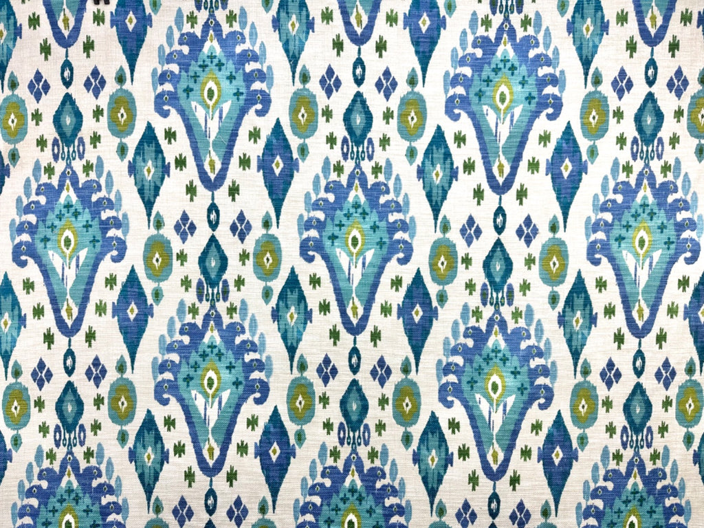 Part of the Kasbah collection, this ikat design is printed on a stunning linen mix base cloth and is suitable for curtains, soft furnishings and upholstery.