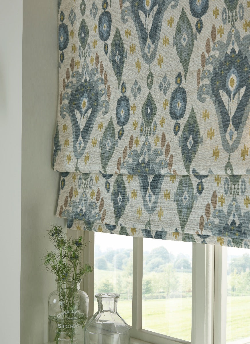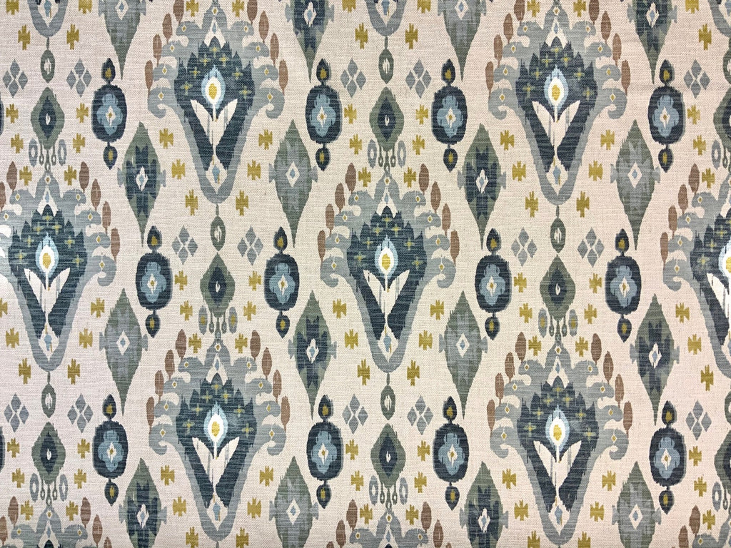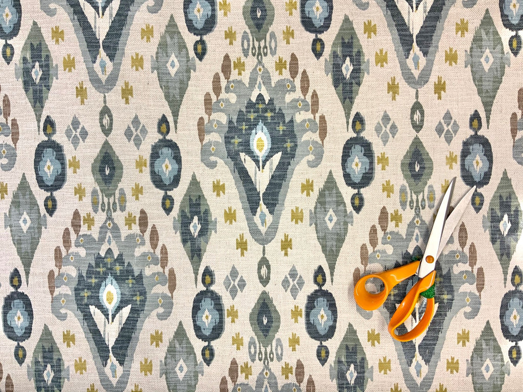Part of the Kasbah collection, this ikat design is printed on a stunning linen mix base cloth and is suitable for curtains, soft furnishings and upholstery.