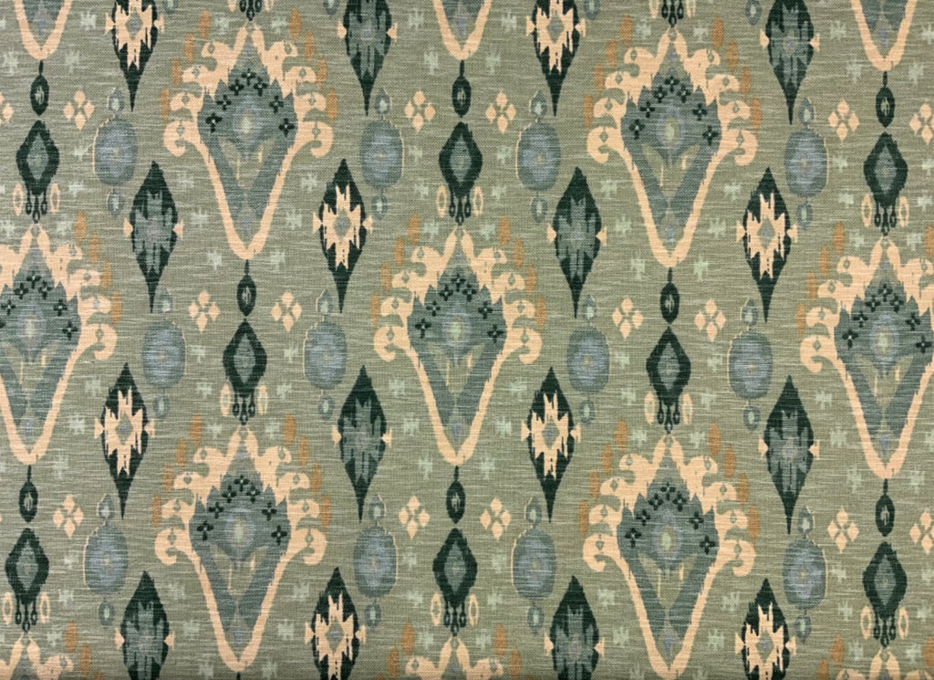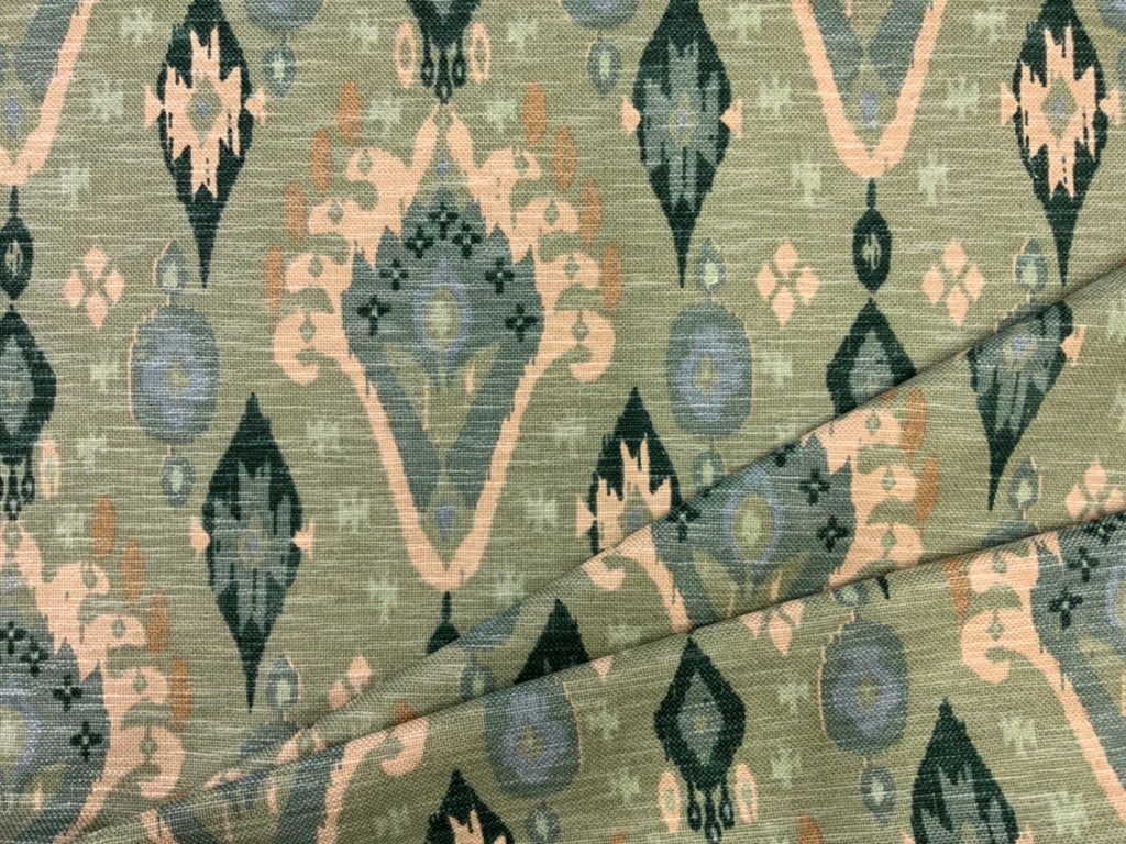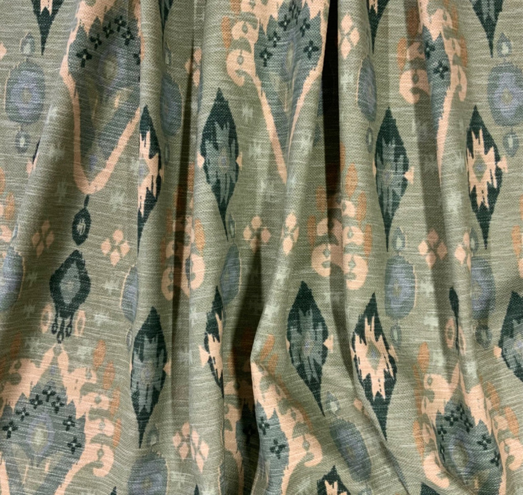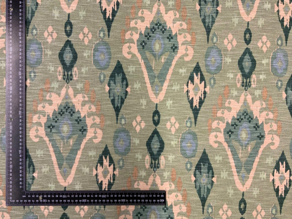 Part of the Kasbah collection, this ikat design is printed on a stunning textured basket weave linen mix fabric. It's base cloth has a hand crafted feel to it and is suitable for curtains, soft furnishings and upholstery.