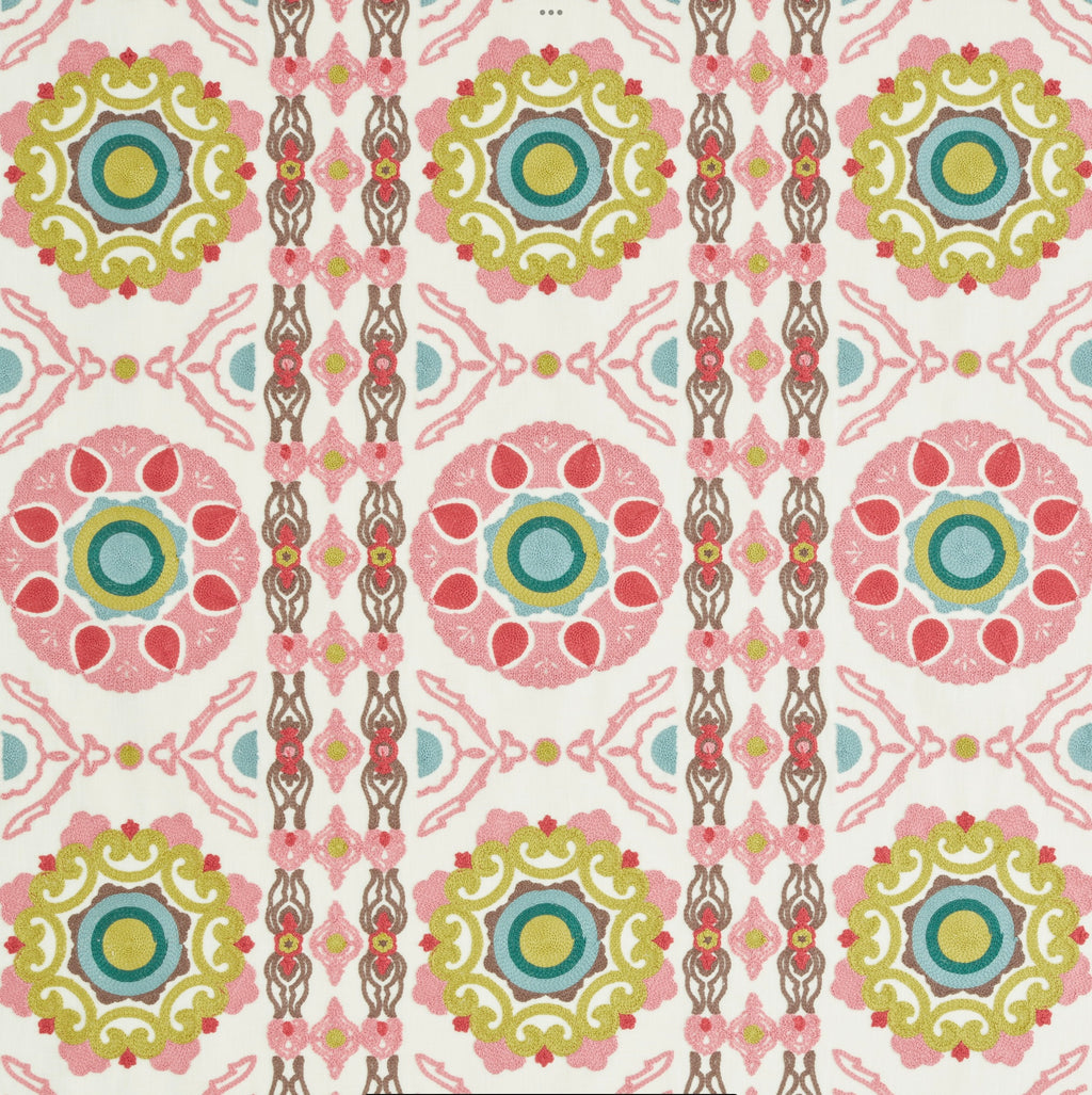 Featuring a striking striped medallion design, Indra Carmine showcases intricate, heavy embroidery that adds depth, texture and rich decorative detail. This beautiful pattern creates a statement look, making it an exceptional choice for curtains and blinds, where its craftsmanship can truly shine.