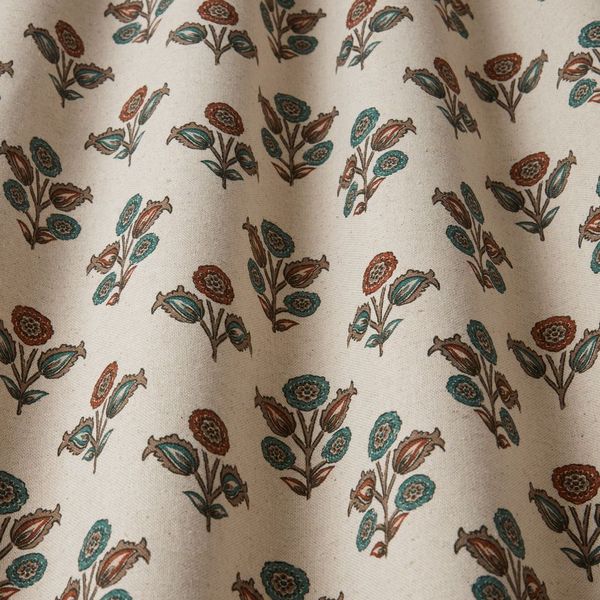 This floral design is part of the Jaipuri collection which is inspired by Indian block printing techniques. Printed on a mid weight cotton linen base cloth this fabric is suitable for curtains and soft furnishings.