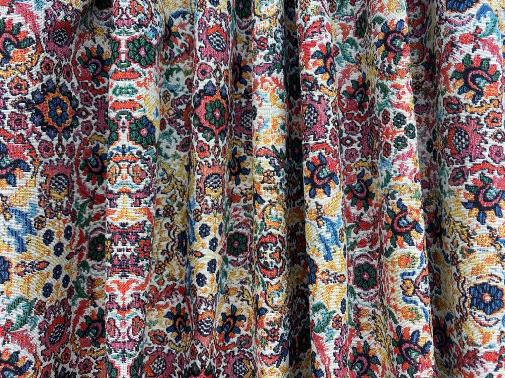 This tapestry fabric is a perfect weight for interior projects such as curtains and light upholstery. These woven designs are also popular for some fashion projects such as bags and jackets.