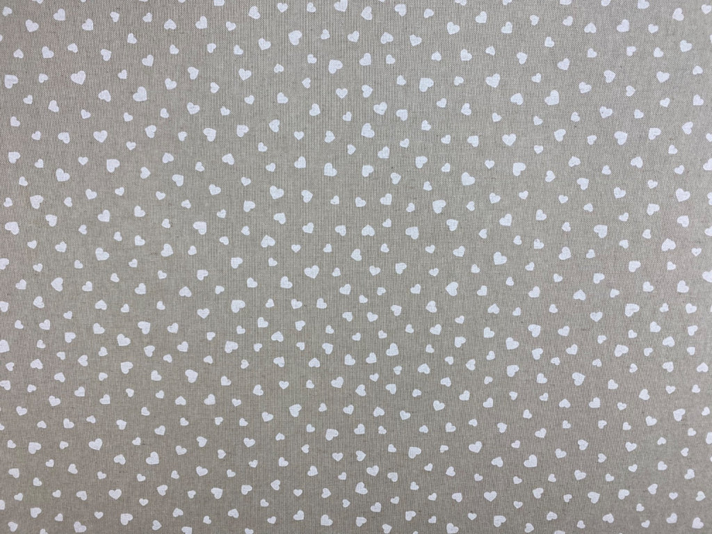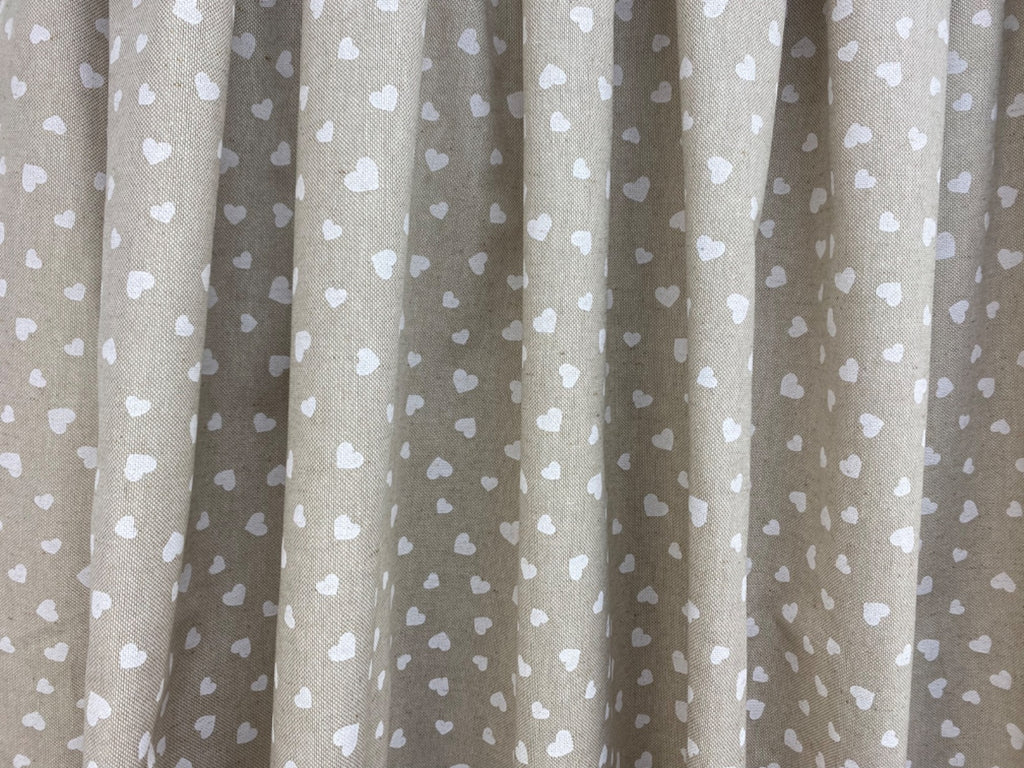 Cotton linen mix fabric printed with a modern love heart design. Suitable for curtains and soft furnishing projects. Free samples available.