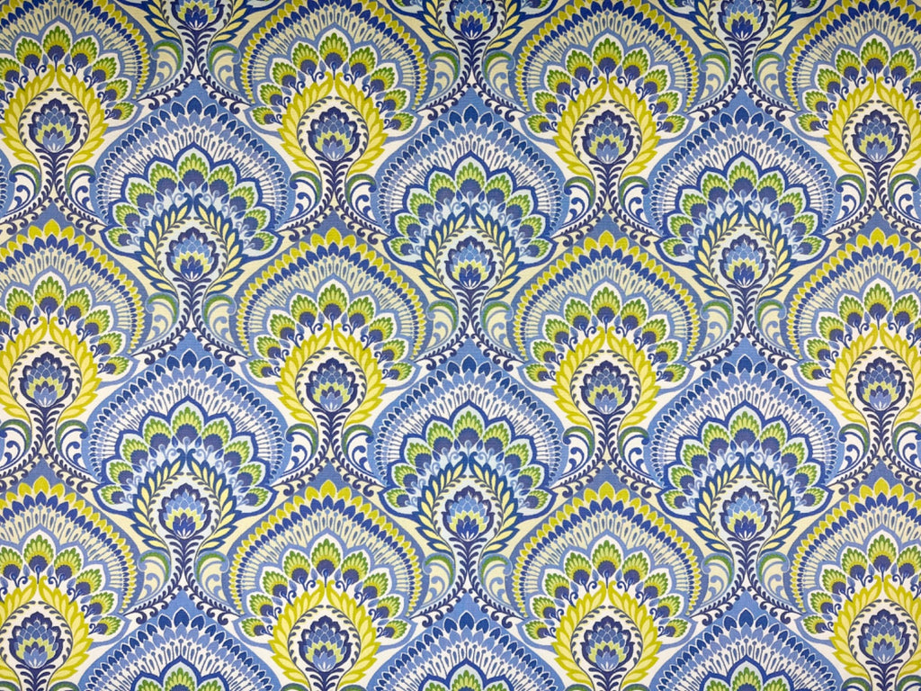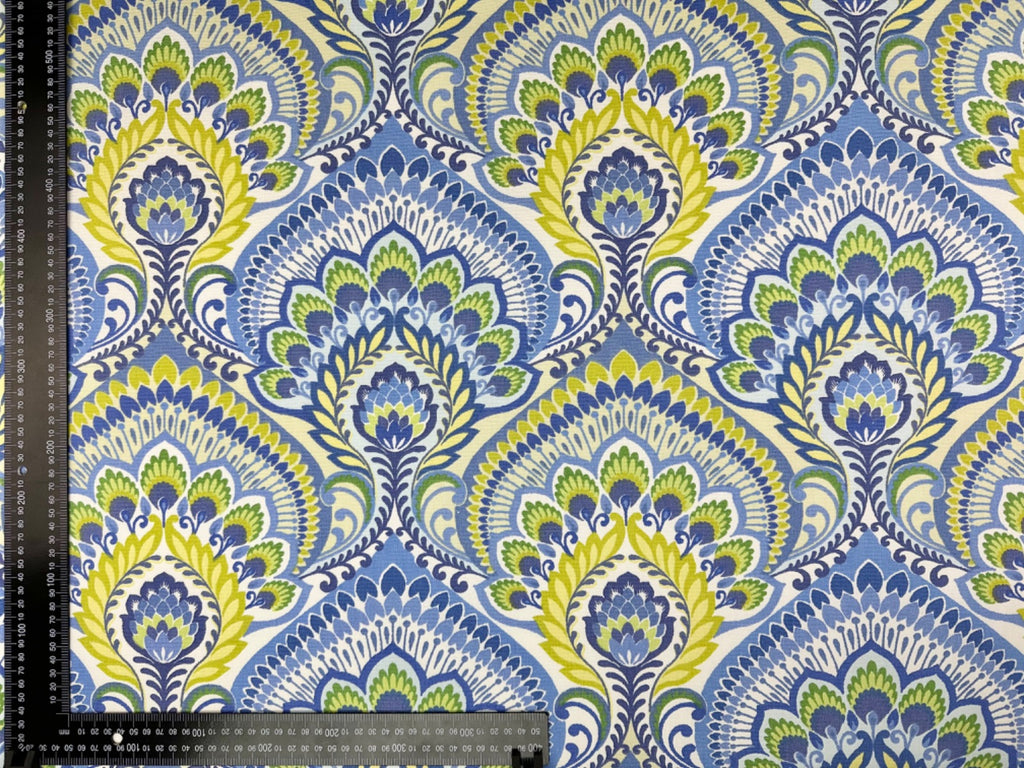 folk design printed on a beautiful 100% cotton base cloth. Suitable for curtains, soft furnishing and light upholstery.