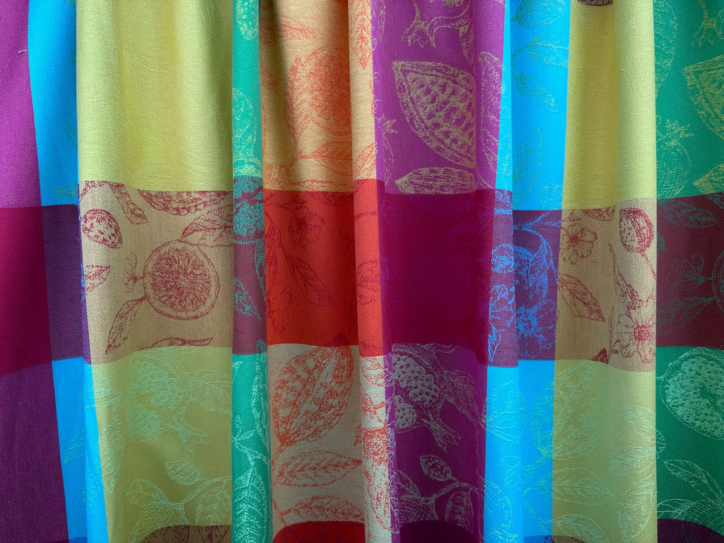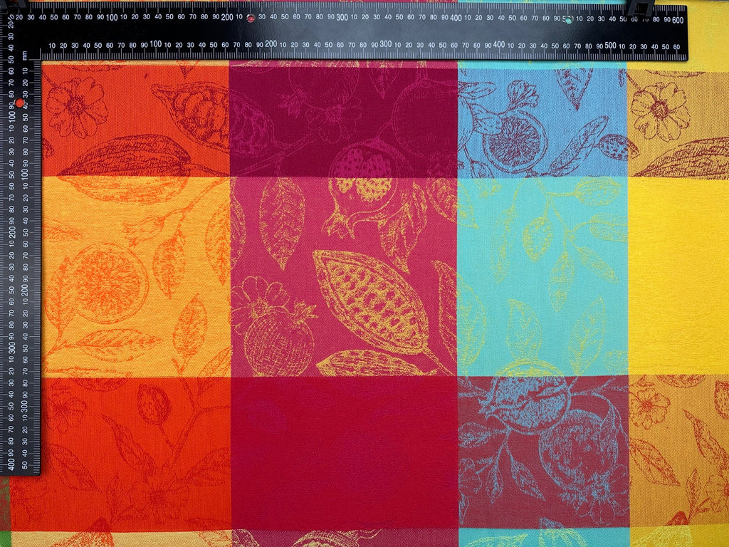 This is extra wide Provence style cotton has a bold check design with a fruit pattern woven within. The fabric has been specifically treated to offer both stain resistant and water resistant properties yet the handle is unaffected and you would be unable to feel the difference between this cloth and any other cotton of a similar weight.