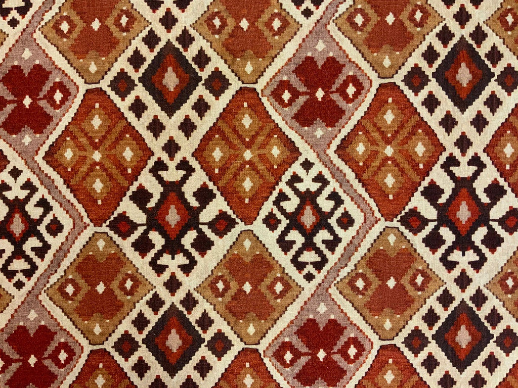 This stunning kilim design is printed on a soft handle viscose linen mix base cloth. As it hangs beautifully it would make up into lovely curtains and could also be used for a variety of soft furnishings projects.