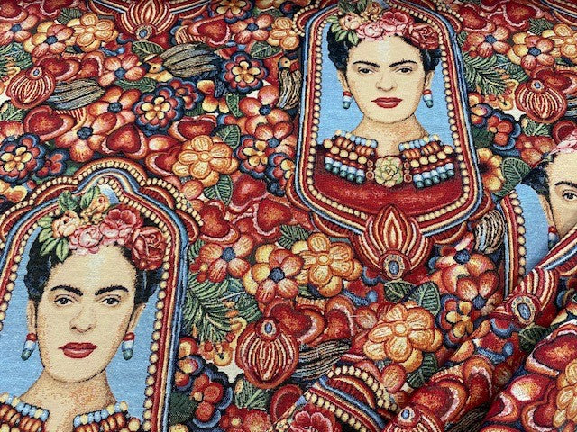 Crafted with a woven jacquard texture, the fabric displays intricate floral motifs alongside a vivid Frida Kahlo portrait, celebrating her passion, creativity, and Mexican heritage. A perfect choice for adding a splash of colour and cultural flair to your interior.