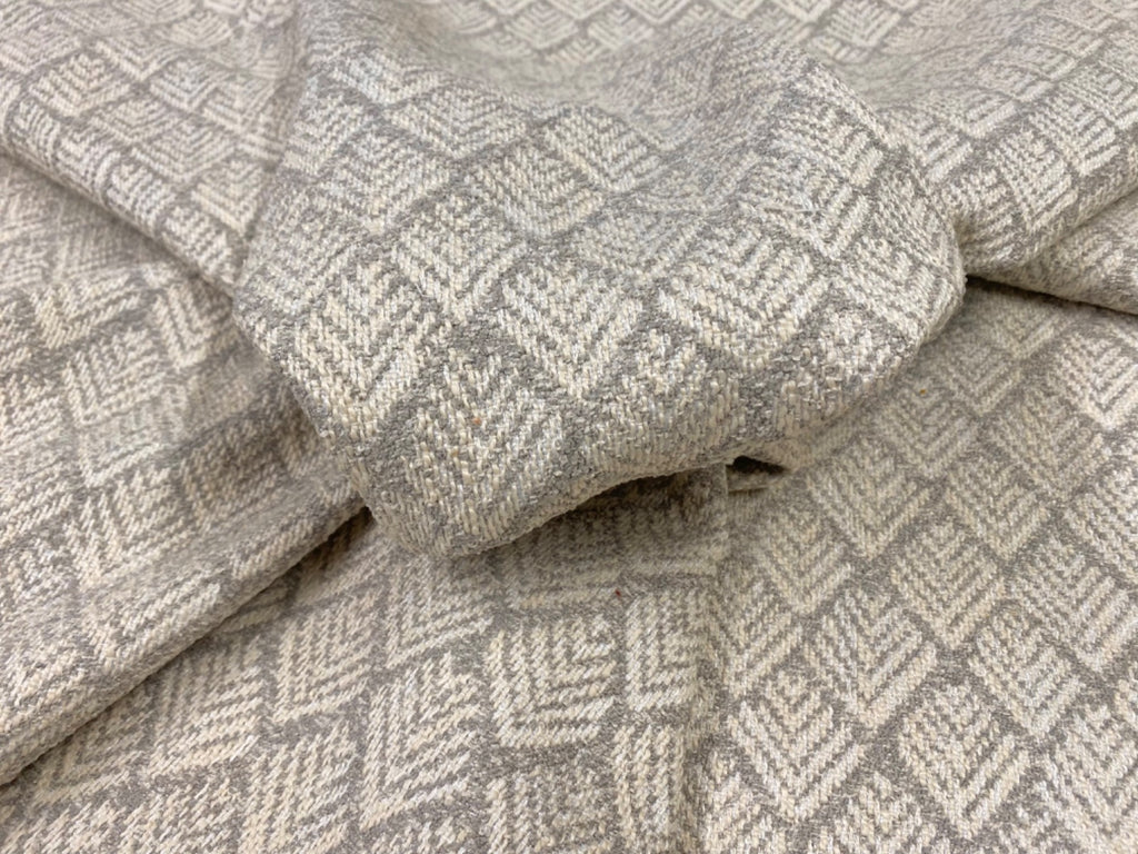 This heavy, textured cloth has a woven herringbone design. Even though the fabric is thick, it is still soft enough for curtains and blinds, yet tough enough that it has a 45.000 martindale rub test for upholstery.