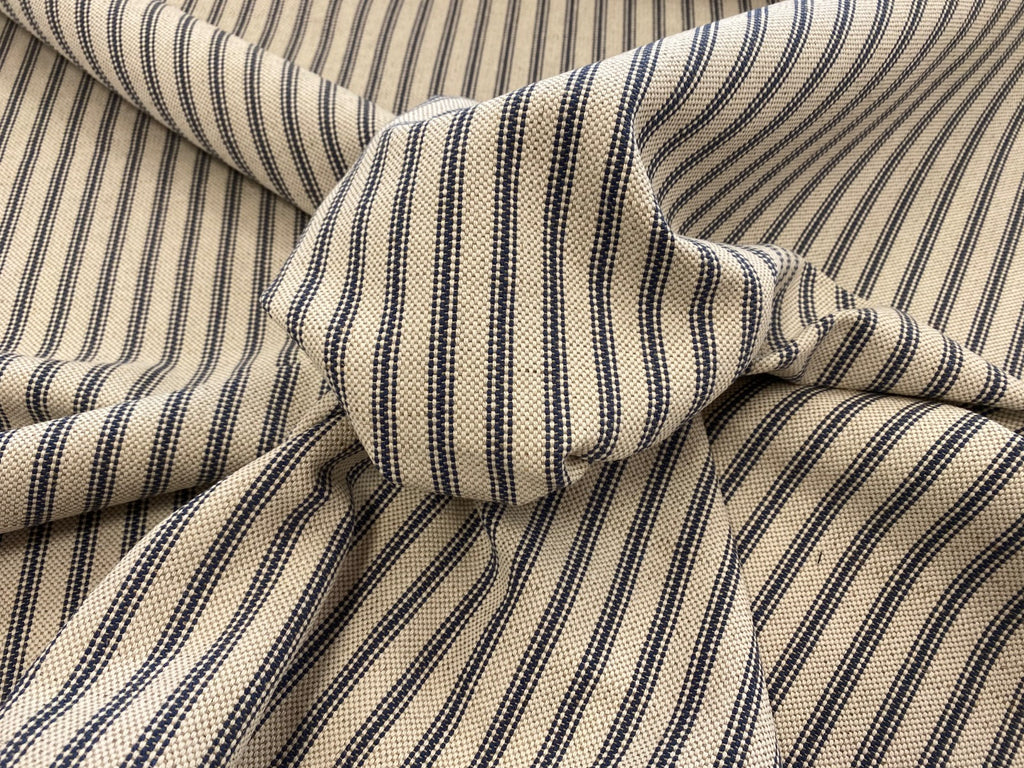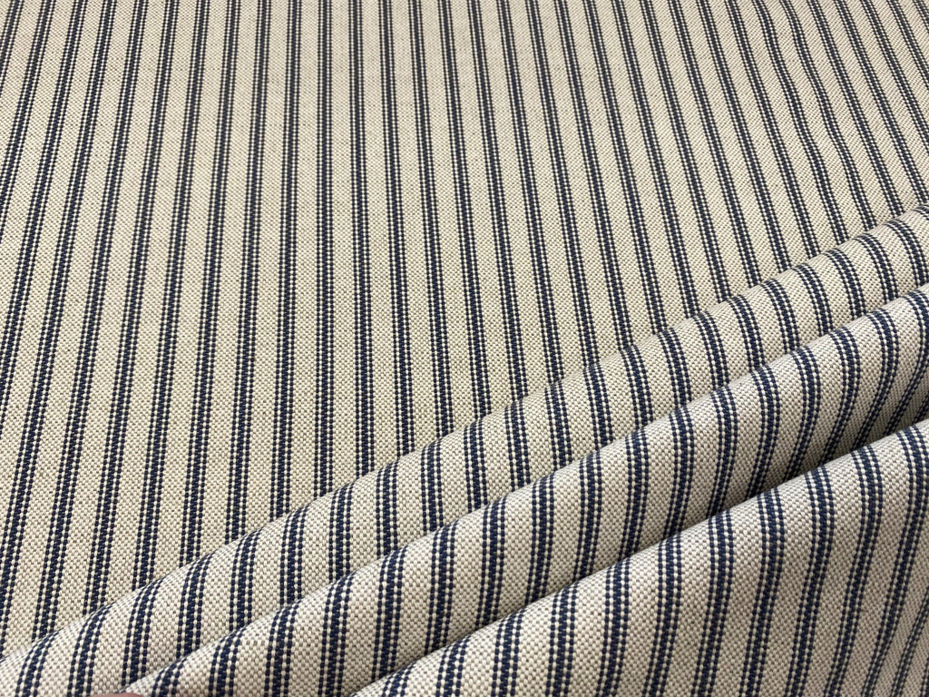 Discover the timeless charm of our navy woven ticking stripe fabric, crafted with a luxurious blend of linen and cotton. Perfect for a range of home décor projects, this fabric offers both durability and aesthetic appeal, making it ideal for everything from upholstery (35,000 martindale) to curtains and cushions.