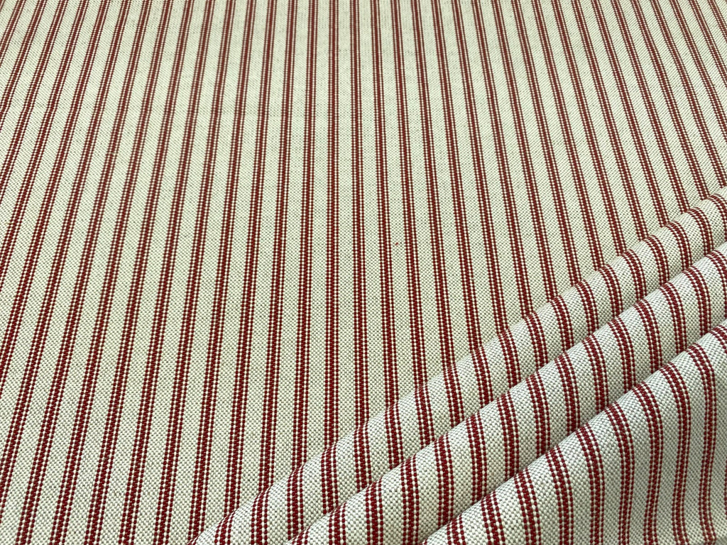 Discover the timeless charm of our Red woven ticking stripe fabric, crafted with a luxurious blend of linen and cotton. Perfect for a range of home décor projects, this fabric offers both durability and aesthetic appeal, making it ideal for everything from upholstery (35,000 martindale) to curtains and cushions.