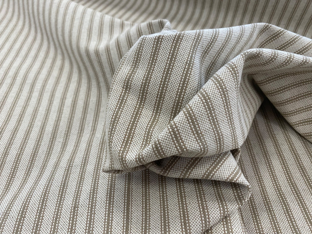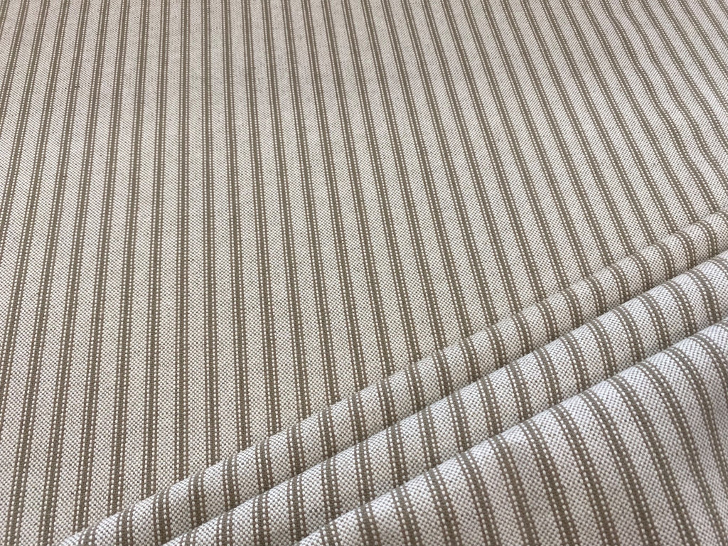 Discover the timeless charm of our Taupe woven ticking stripe fabric, crafted with a luxurious blend of linen and cotton. Perfect for a range of home décor projects, this fabric offers both durability and aesthetic appeal, making it ideal for everything from upholstery (35,000 martindale) to curtains and cushions.