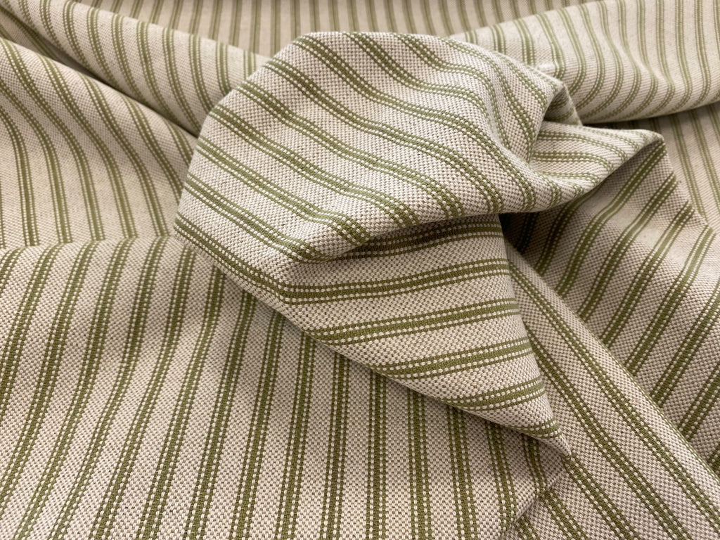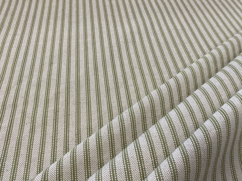 Discover the timeless charm of our Lime woven ticking stripe fabric, crafted with a luxurious blend of linen and cotton. Perfect for a range of home décor projects, this fabric offers both durability and aesthetic appeal, making it ideal for everything from upholstery (35,000 martindale) to curtains and cushions.