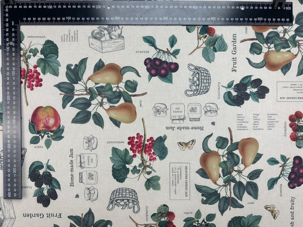 Bring a touch of traditional charm to your space with this Fruit Garden-themed fabric, featuring a delightful mix of illustrated apples, pears, grapes, cherries, and blackberries. Accented with vintage-style text like "Home-made Jam", "Fresh and Fruity", and labelled sketches, this design is perfect for a country kitchen, cottage décor, or vintage farmhouse style.