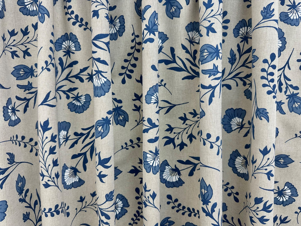 Elevate your interior projects with this elegant navy floral print fabric on a soft natural background. Featuring a timeless botanical design with delicate flower and leaf motifs, this fabric is perfect for adding a touch of classic charm to your home décor.