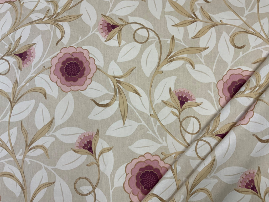 Traditional floral design printed on a FR treated base cloth suitable for curtains.