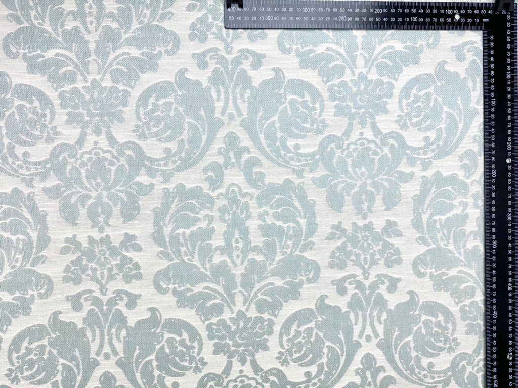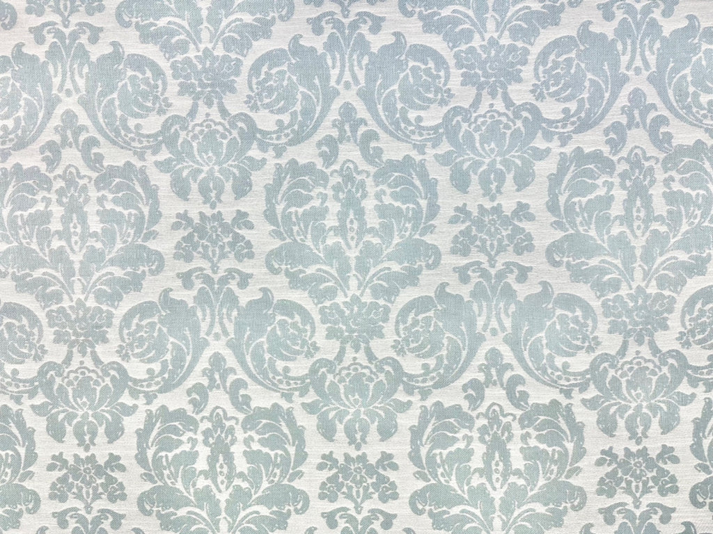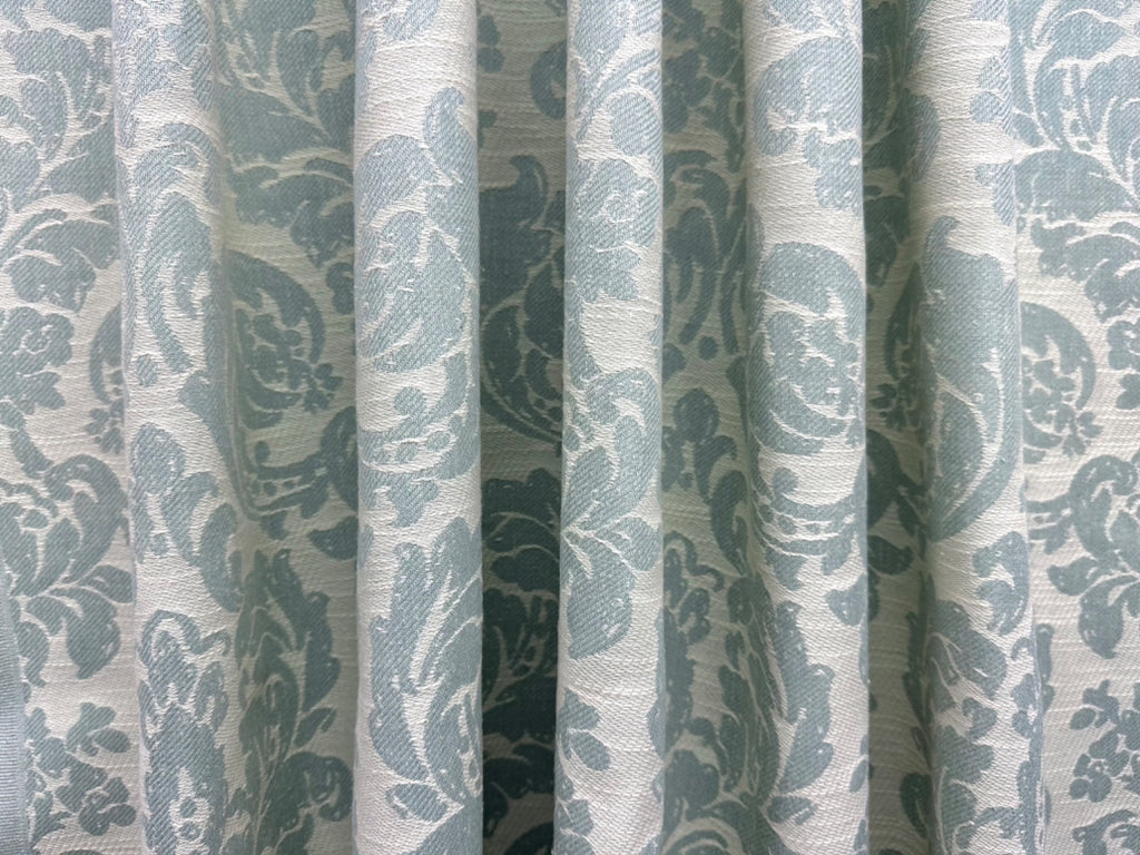 High quality traditional woven damask in a soft duck egg colour. Ideal for making up curtains, blinds and soft furnishings. Suitable for occasional upholstery.