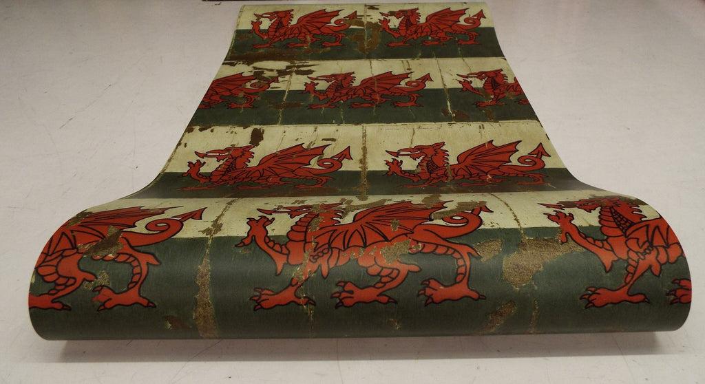 Designed and printed in the UK, a non woven, high quality, wallpaper with Welsh flags in a distressed graffiti/warehouse style.