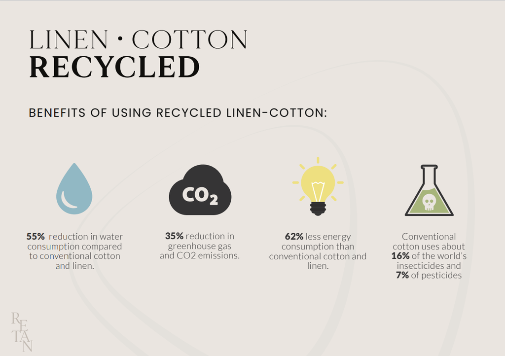 This lovely recycled linen mix from our 'Eco Range' has so many great production features that help the fabric meet the Global recycled standard. Using 100% recycled fibres of both cotton and linen to create this cloth.